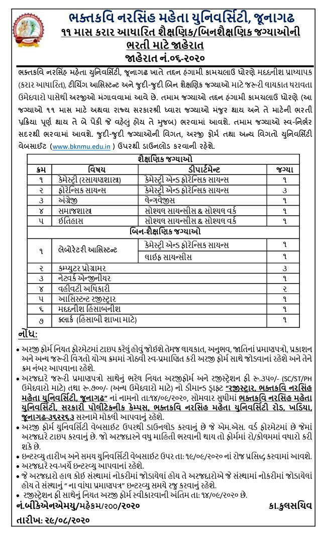 Bhakt Kavi Narsinh Mehta University (BKNMU), Junagadh published an official notification for Recruitment of Teaching & Non Teaching Posts. Eligible candidates can apply for this recruitment.